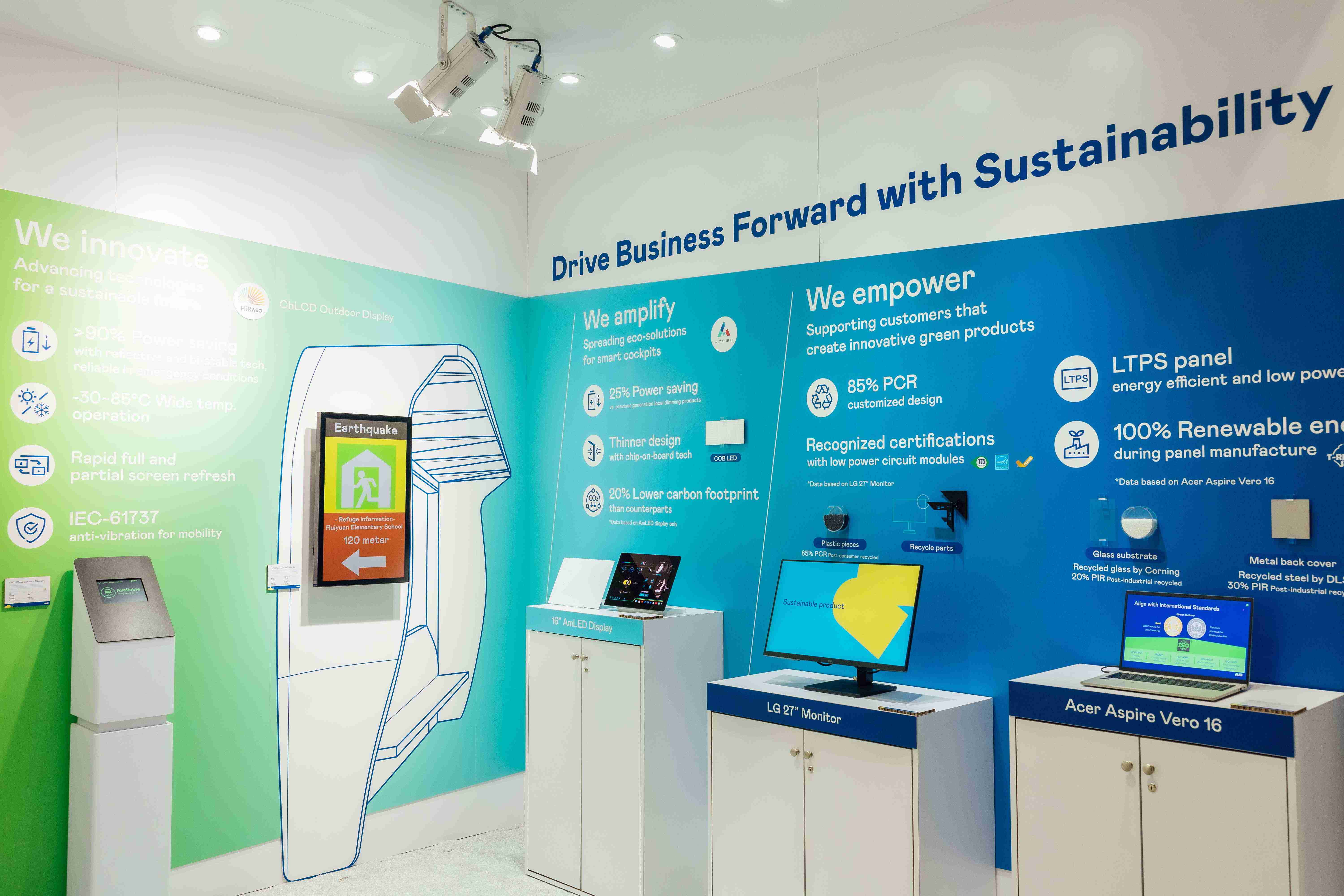 杏悦2运用创新显示技术HiRaso胆固醇液晶双稳态技术达到显示零耗能、、、、扩大节能省电的AmLED显示技术应用于车用产品、、、以再生的消费后回收(PCR)塑料及全绿电生产之面板,,,,应用于笔电及萤幕,,,,增加绿色价值。。。