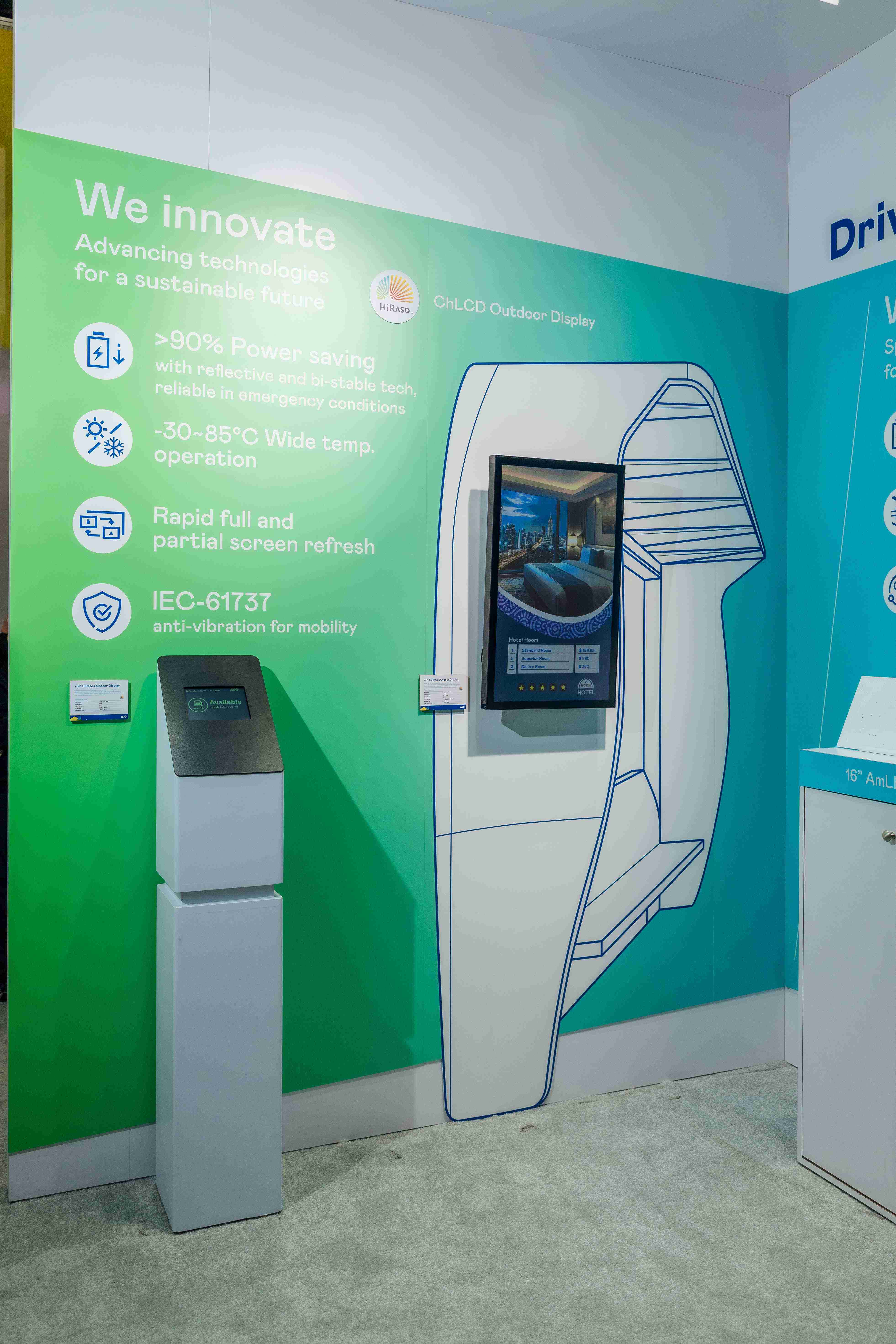 HiRaso胆固醇液晶显示器运用反射环境光线的方式,,呈现影像显示时零耗能的环保省电诉求,,光线愈强愈能呈现绝佳的色彩饱和度及显示效果,,同时在摄氏-30度至85度间宽温的使用优势,,,为户外电子看板的新首选。。