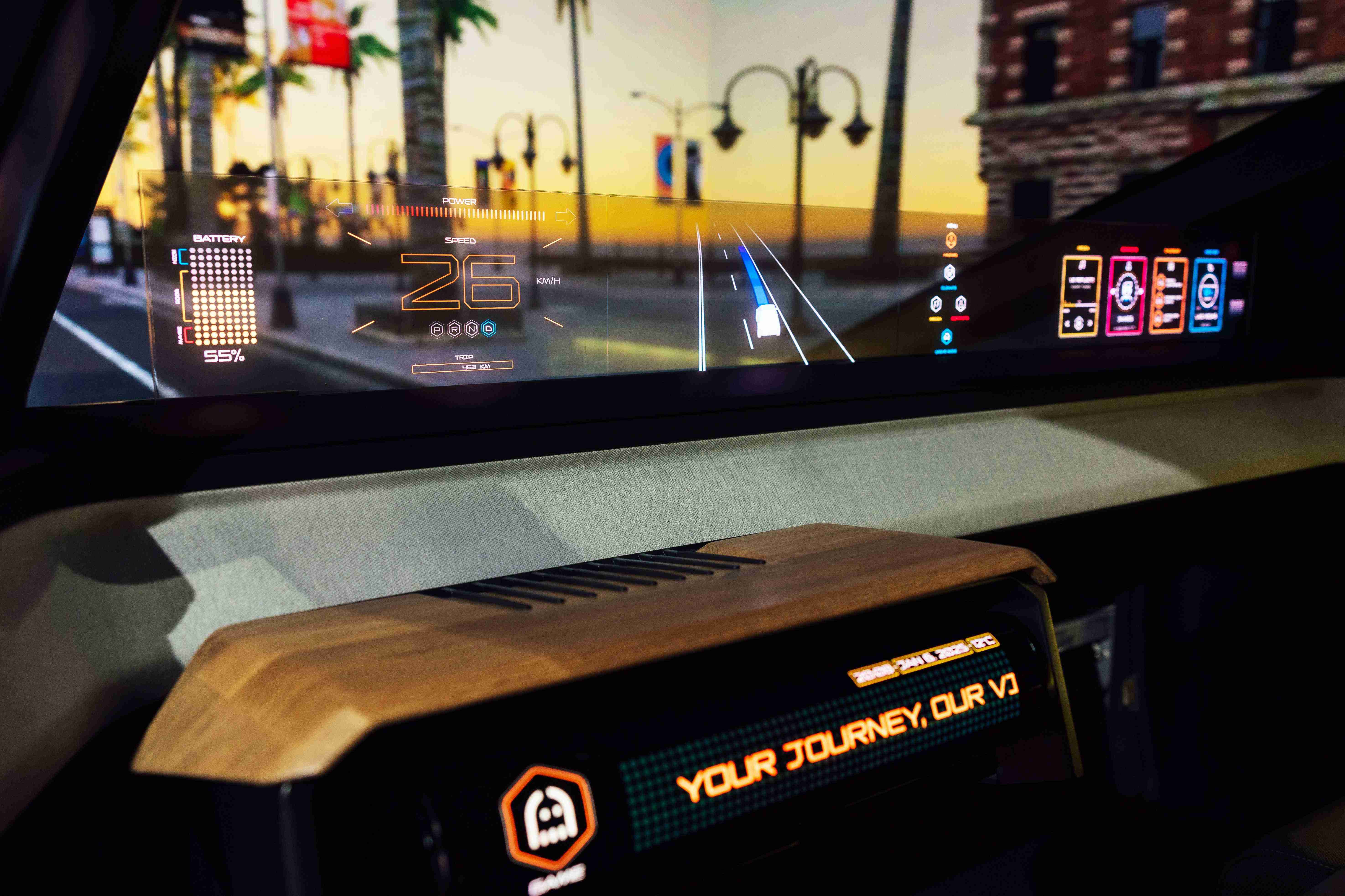 车用运算方案驱动无界透明显示介面(Horizon Image Glass),,整合仪表板、、、中控及副驾显示功能为一体式全景呈现,,不仅提供清晰的外部视野,,,亦能即时显示车辆状态、、、、导航及路况资讯,,,并赋予个性化设定与驾驶安全警示等加值化服务。。。