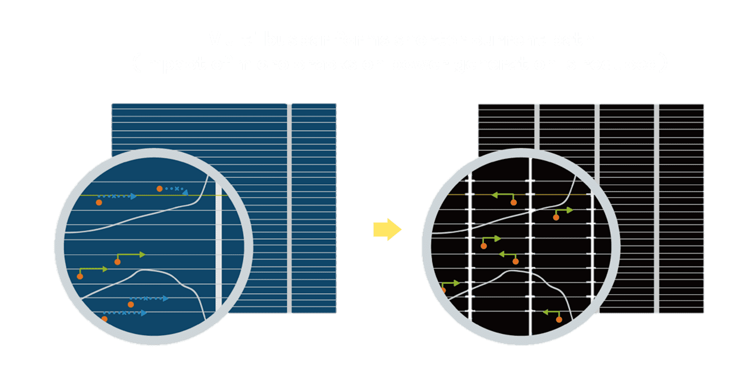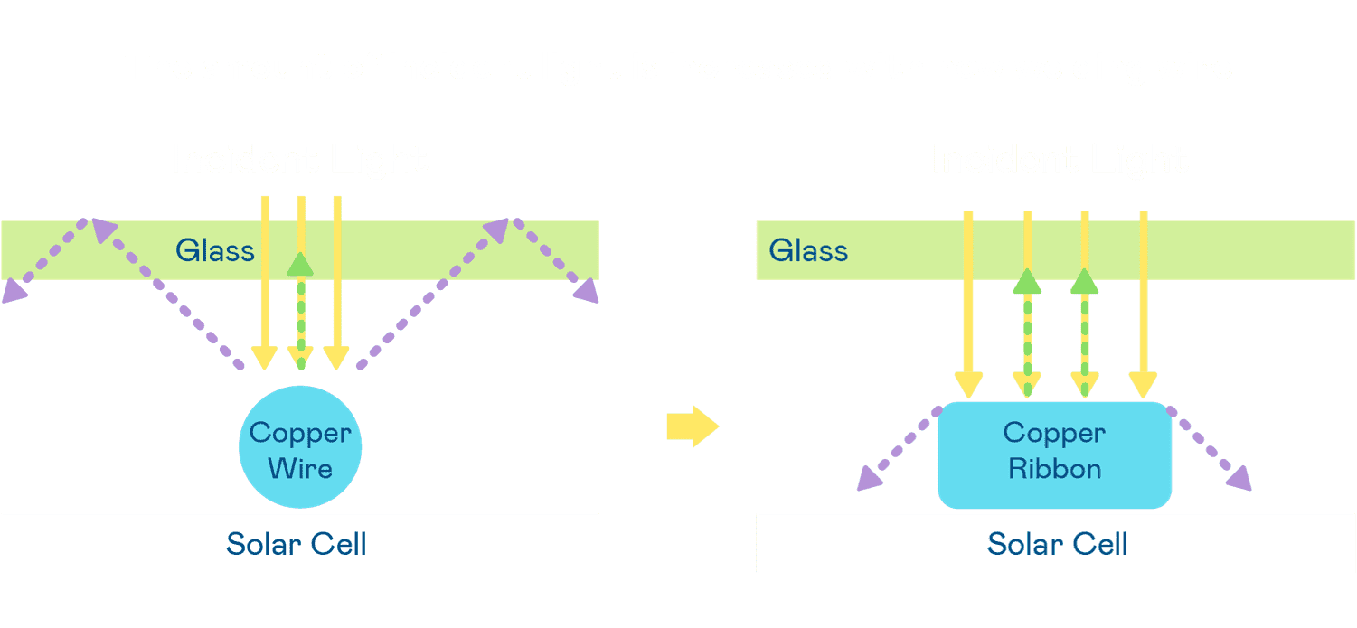 - 电池使用多条铜导线 (Copper wire) 于电池片上形成较短的电流路径,,,,提高电流收集效率,,,,采用圆形设计的铜导线较传统扁平式的铜焊带 (Ribbon),,,可增加入射至电池的光线量。。