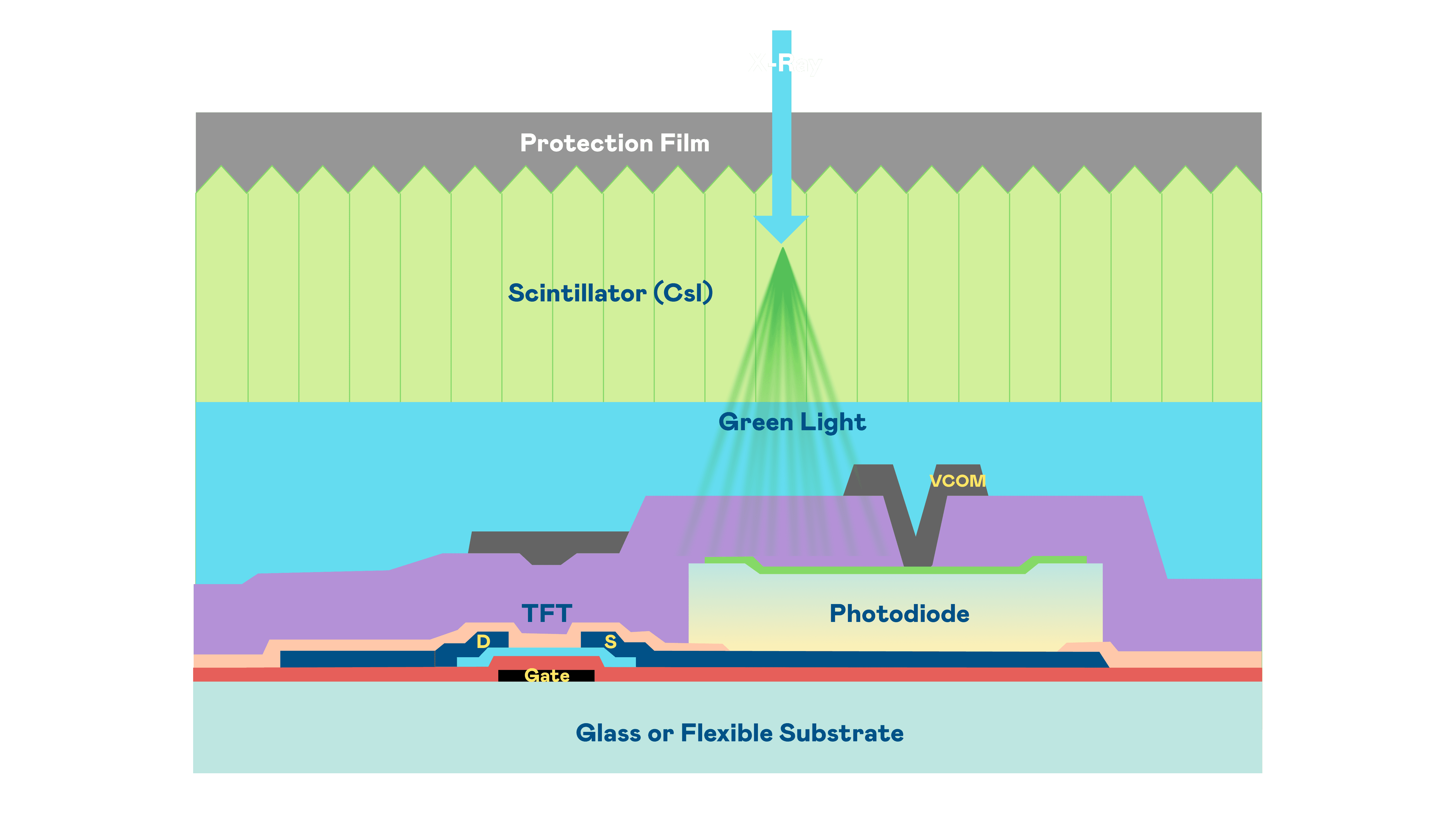 杏悦2的X光影像感测阵列使用薄膜电晶体 (TFT) 作为每个像素的读取开关,,搭配光电二极体(Photodiode)的光电转换元件,,,,用以感测X光影像讯号。。。。